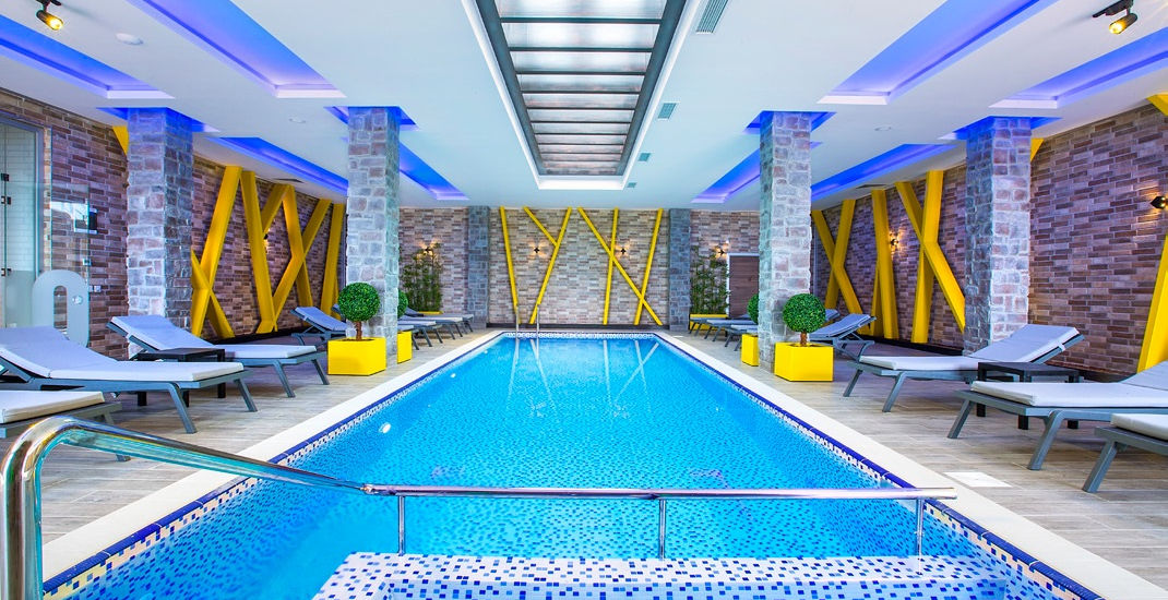 large outdoor swimming pool, separated swimming pool area with waterslides, gorgeous spa-area, where you can find eg. Turkish bath (hamam), sauna, fitness, indoor swimming pool also an underground parking and more facilities..